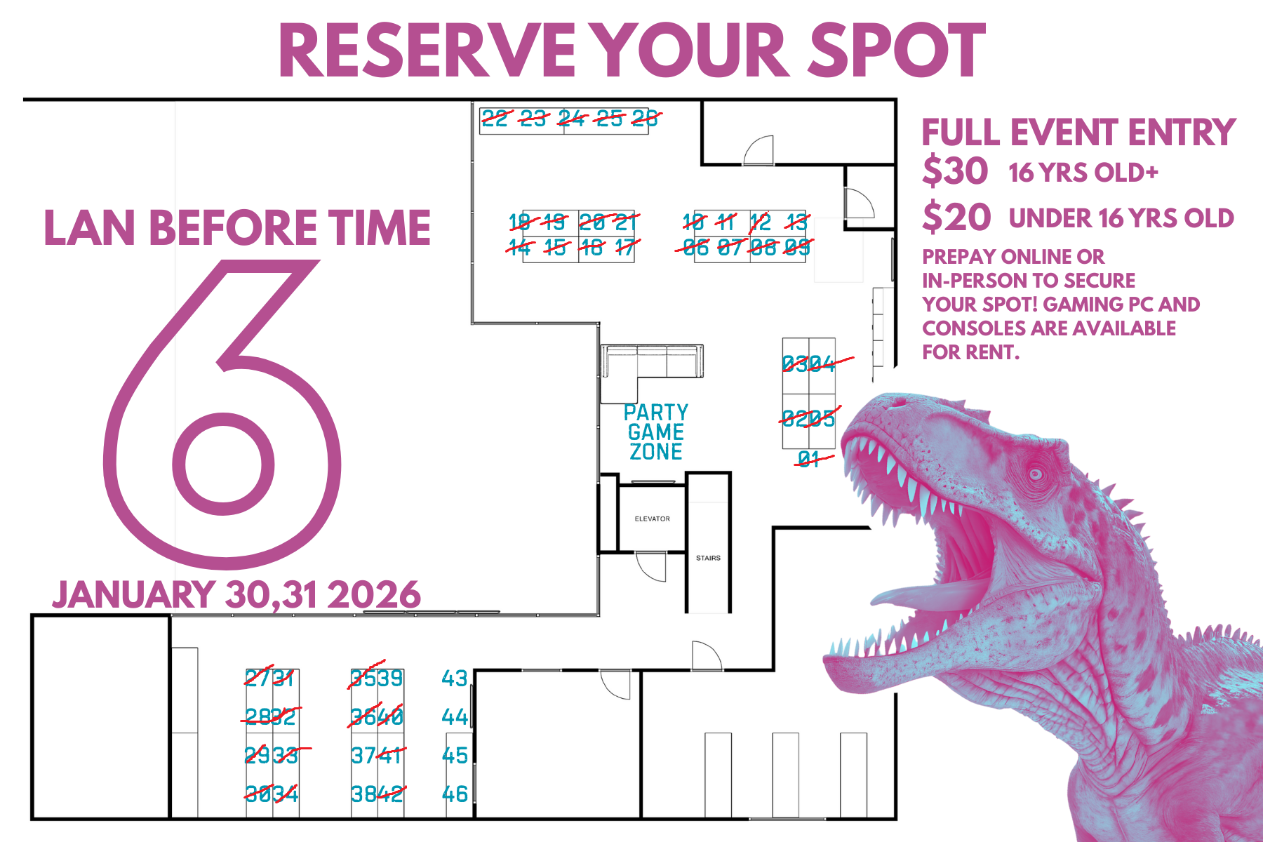There are PC’s and consoles that are available to borrow for the event. Quantities are limited, so let us know asap if you need to reserve one. ALL PC’s AND XBOXs HAVE BEEN RESERVED