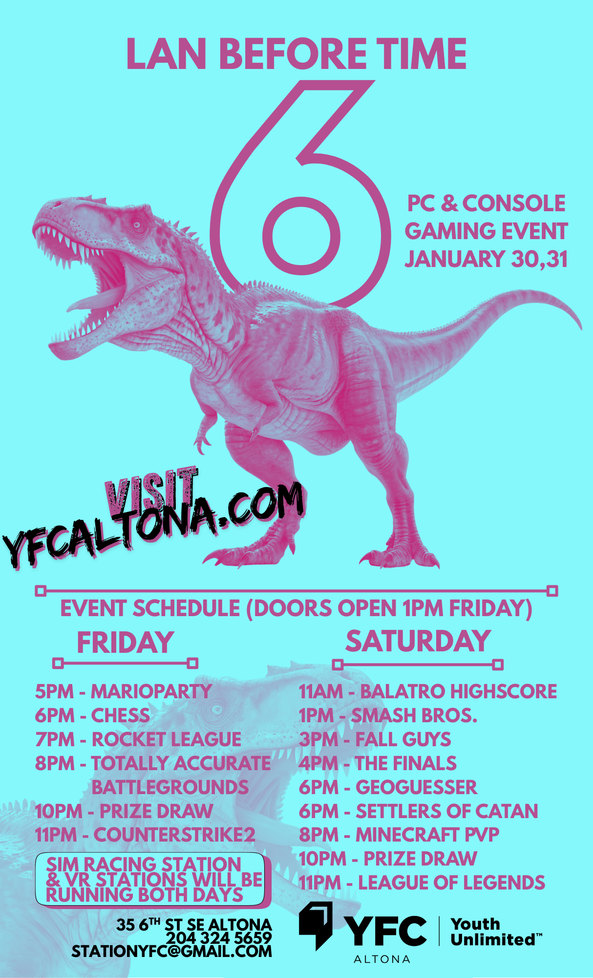 Join us for our annual gaming weekend at YFC Altona! LAN Before Time 6 is happening January 30 & 31. Entry for the weekend is a bit different this year, for participants 16 years old and older the full event entry is $30, for anyone under 16 years old is $20 for the full event. And as always is funding is an issue, please contact us, we will make something work.